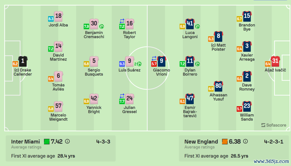 迈阿密外洋(433):1-卡伦德;57-魏甘特,6-阿维莱斯,14-马丁内斯,18-阿尔巴;42-布莱特,5-布斯克茨,30-克雷马斯基;24-格雷塞尔,9-苏亚雷斯,16-泰勒